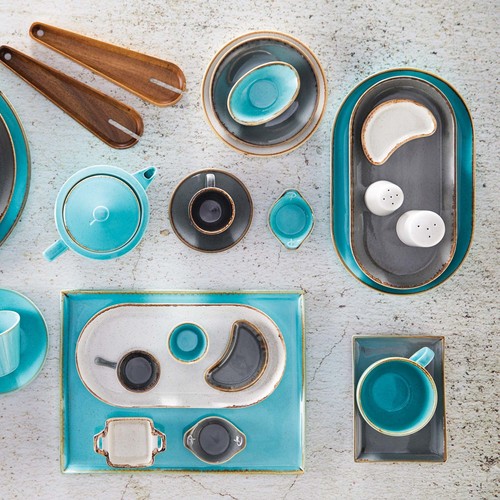 Kolekcja Seasons, inspirowana japońską filozofią Wabi-Sabi, podkreśla piękno niedoskonałości i naturalność upływającego czasu. W procesie produkcji zastosowano reaktywne szkliwo, które nadaje każdemu produktowi indywidualny charakter i niepowtarzalny efekt wizualny. Dzięki ręcznemu zdobieniu brzegów każdy element kolekcji jest unikatowy. Linia Laguna wyróżnia się kolorem błękitny niebieski, który harmonijnie łączy się z pozostałymi odcieniami kolekcji, tworząc spójną i elegancką całość.